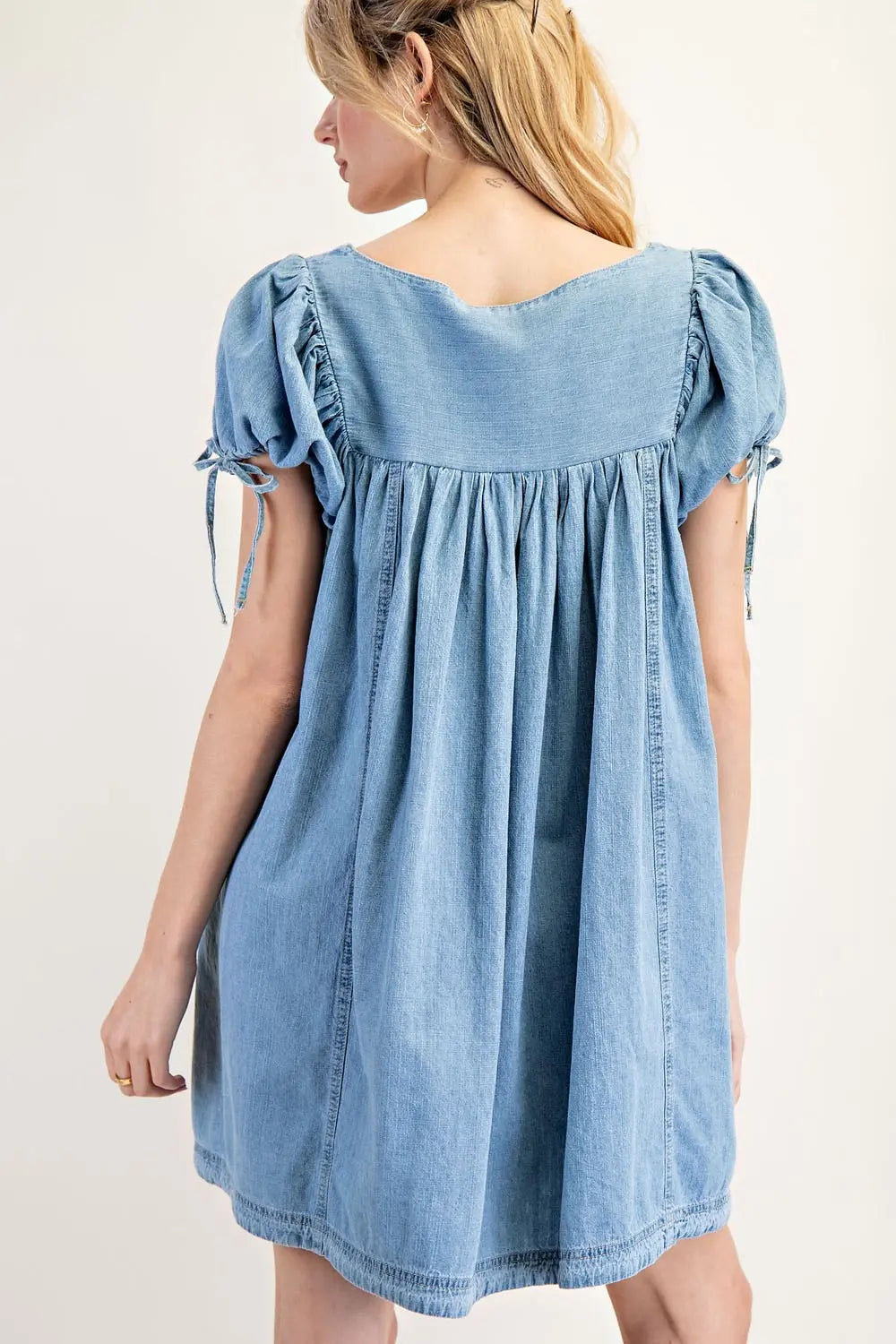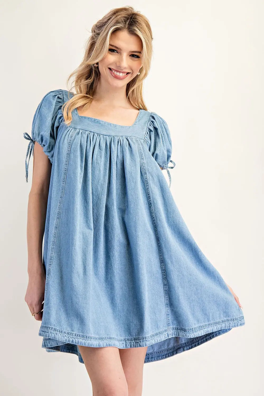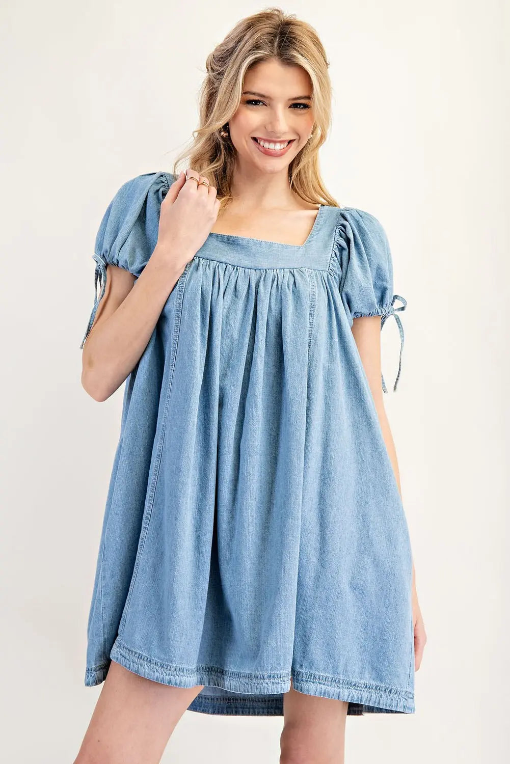 This mineral washed denim dress showcases a square neckline, voluminous puff sleeves with delicate tie details, soft gathered pleats, and a relaxed A-line silhouette, complemented by two functional side hip pockets for an effortlessly charming and practical vintage-inspired look.