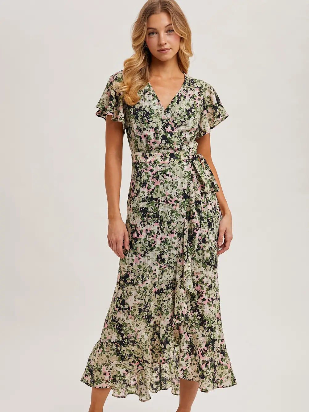The floral print wrap ruffled midi dress is a feminine and flowy piece that beautifully combines elegance with a relaxed fit. Featuring a classic wrap design, this dress cinches at the waist, enhancing your silhouette while offering an adjustable fit. The ruffled detailing along the neckline, hem, or sleeves adds a romantic touch, making it perfect for both casual and semi-formal occasions. The floral print brings a fresh, vibrant feel to the outfit, making it an ideal choice for spring and summer days. The midi length offers a modest yet stylish look that can be paired with heels or sandals.