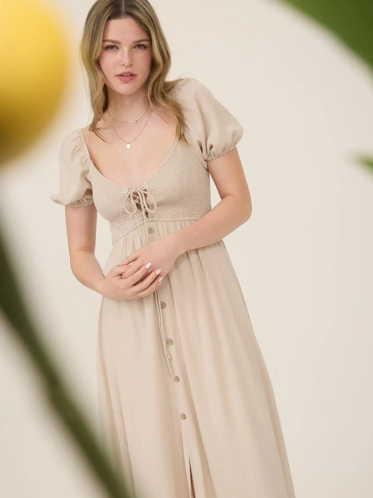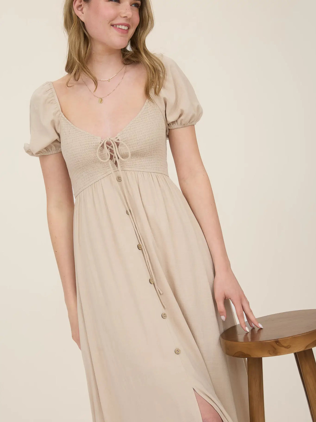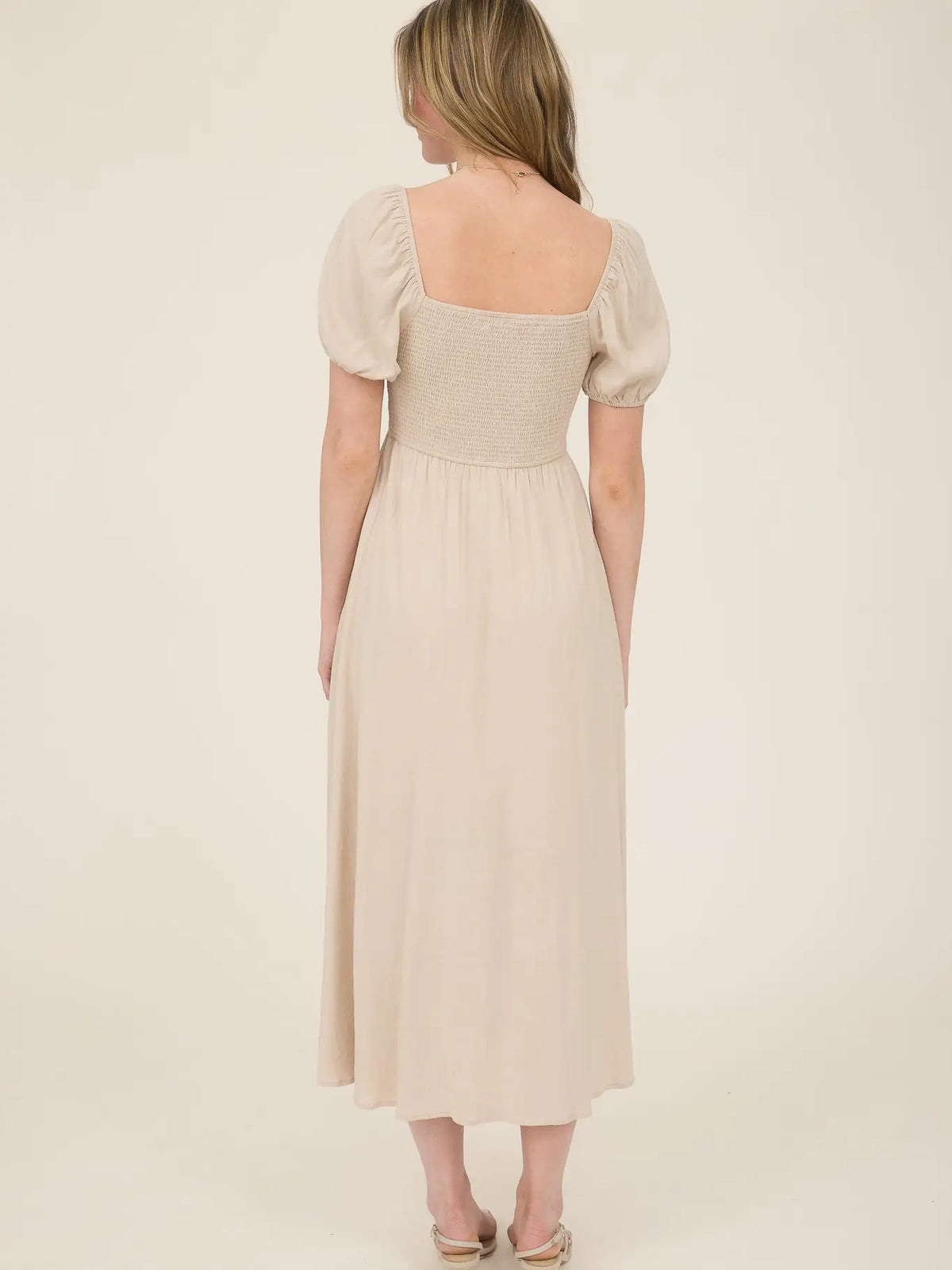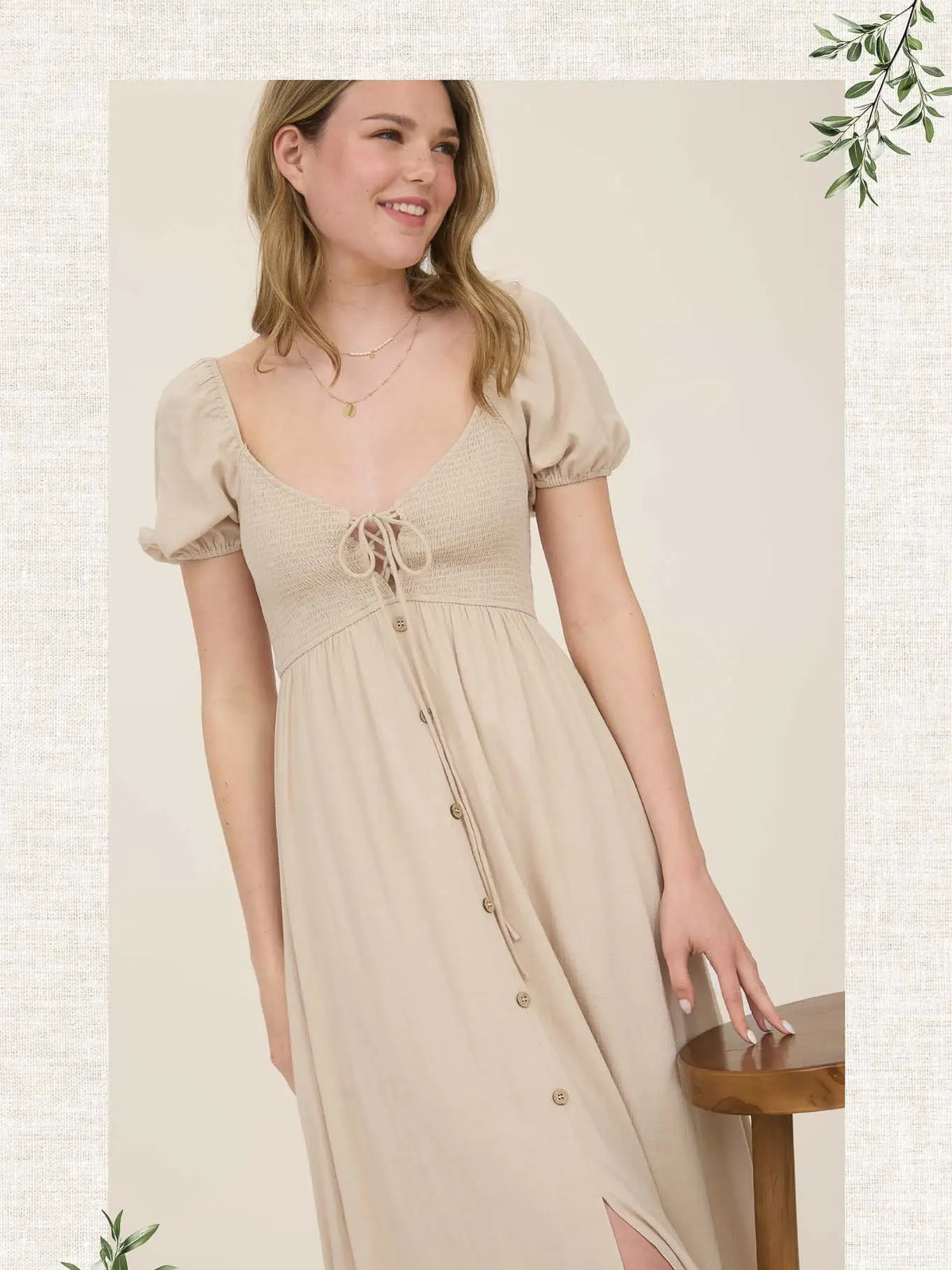 This taupe sweetheart neckline dress combines timeless elegance with effortless comfort. Featuring a flattering smocked bodice and short sleeves, it hugs your figure while allowing easy movement. Perfect for both casual outings and special occasions, this dress offers a versatile, chic look that enhances your natural style.