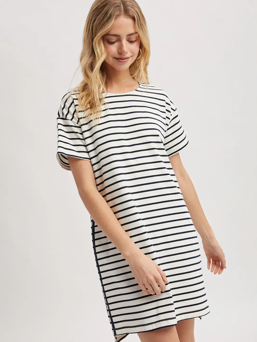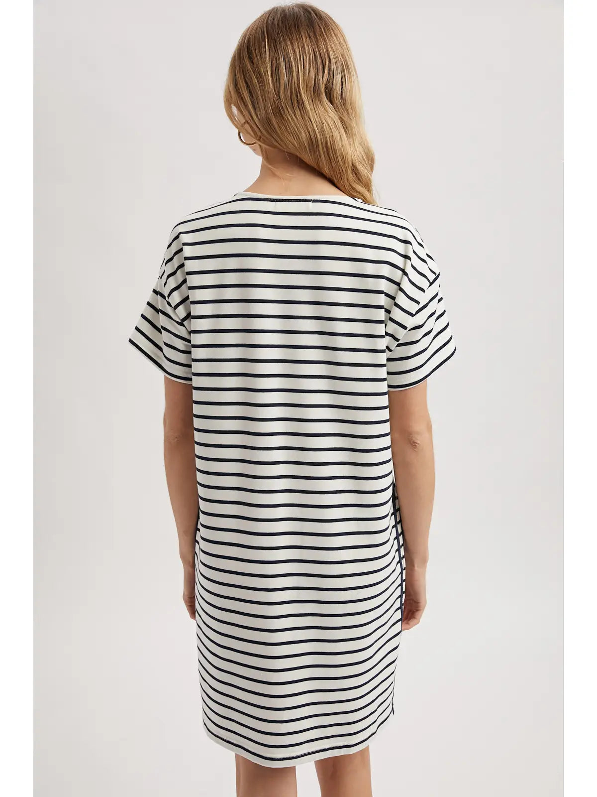 Timeless navy and white stripes meet modern practicality in this versatile dress. Crisp horizontal stripes create a classic nautical aesthetic, while decorative side trim adds a polished finishing touch. Functional pockets keep your essentials close without compromising style. Perfect for casual outings, weekend adventures, or layered styling throughout the seasons.