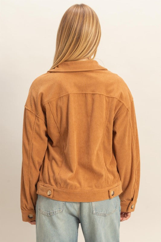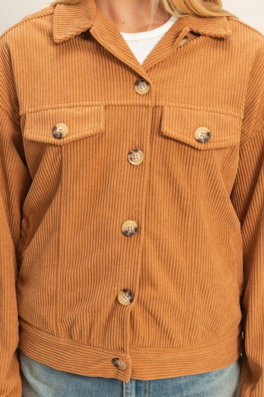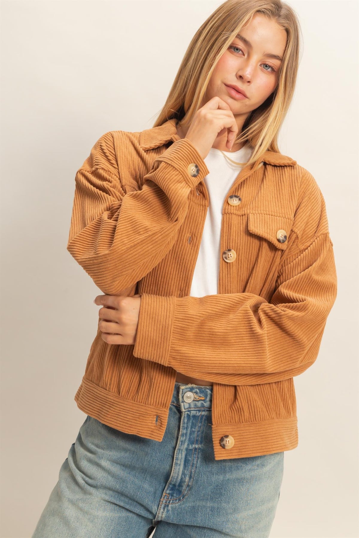 Stay effortlessly stylish and practical with this mustard corduroy jacket. Featuring long sleeves with buttoned cuffs and a button-front closure, it offers both comfort and an adjustable fit. Designed with flap pockets, it provides convenient storage while adding a classic touch. Perfect for layering, this jacket combines timeless corduroy texture with functional details to elevate your everyday look.