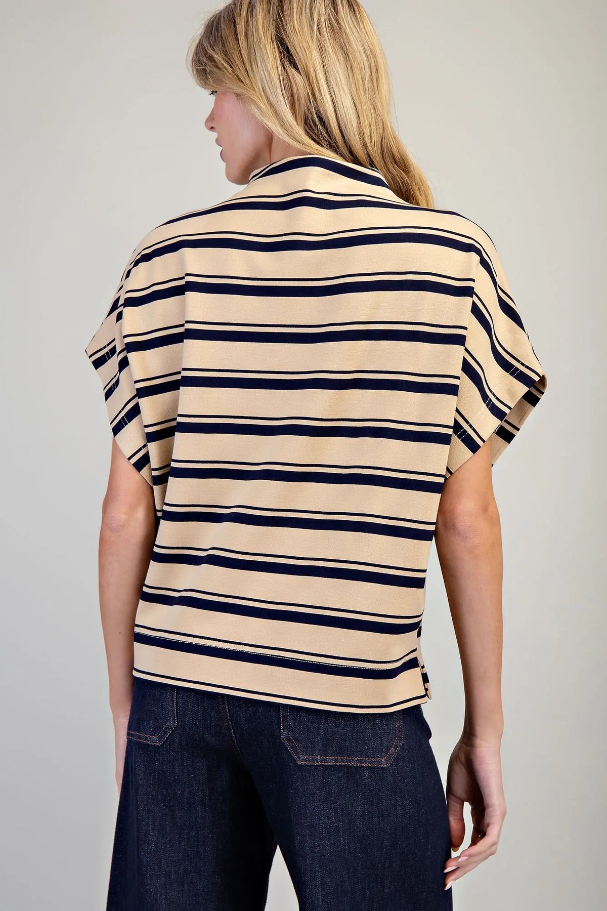 This short sleeve top features a relaxed boxy silhouette with dropped shoulders, a wide mock neckline, and bold horizontal stripes for a casual yet polished look.