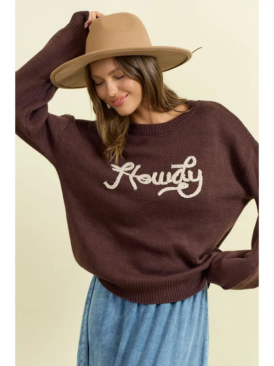 HOWDY' LETTER EMBROIDERED ROUND NECK OVERSIZED SWEATER TOP - Features a bold "Howdy" letter embroidery across the front for a playful, trendy look - Relaxed, oversized fit for maximum comfort and effortless style - Classic round neckline for easy layering and a timeless silhouette - Long sleeves with ribbed cuffs and hem for a snug, finished touch