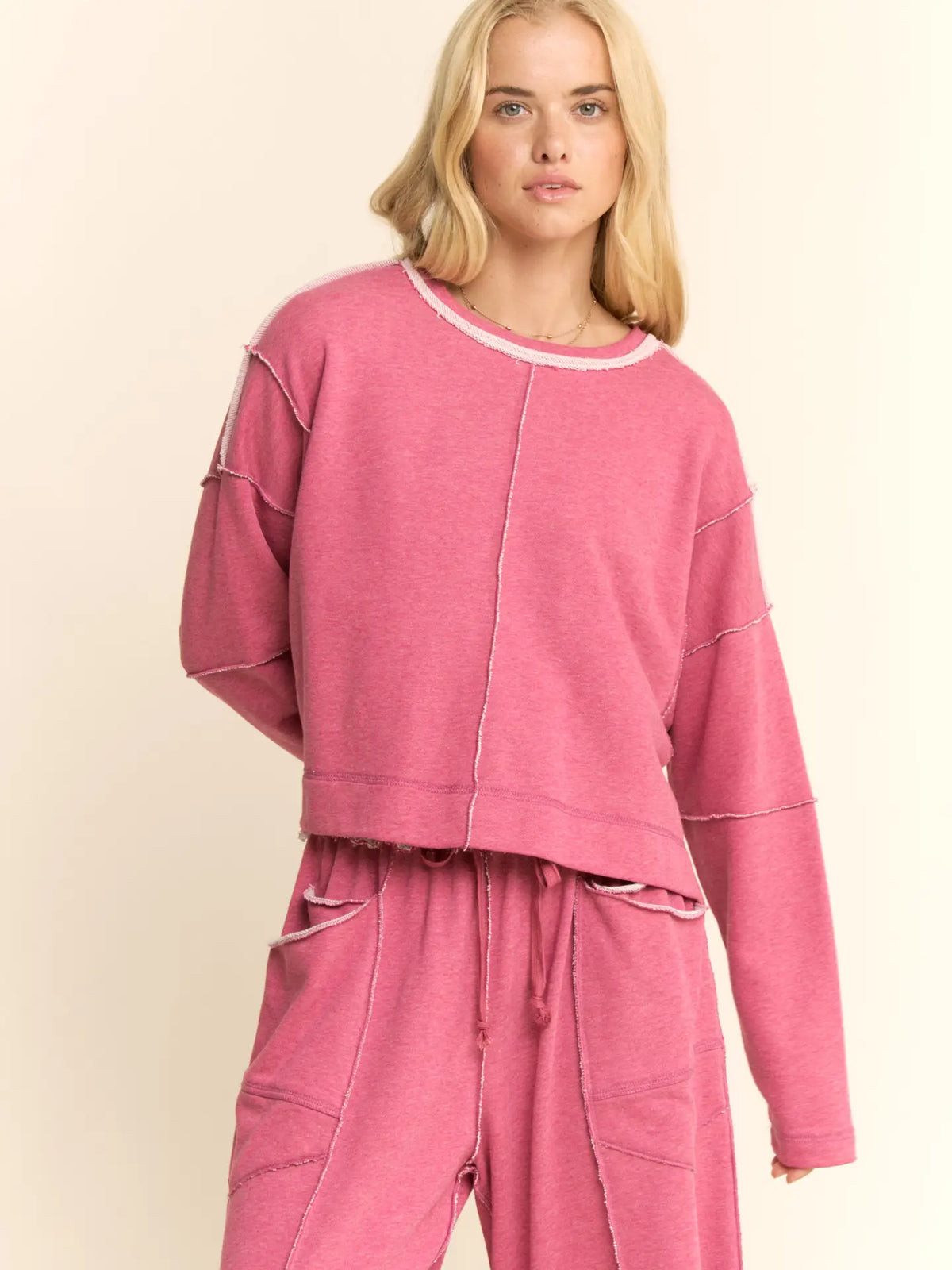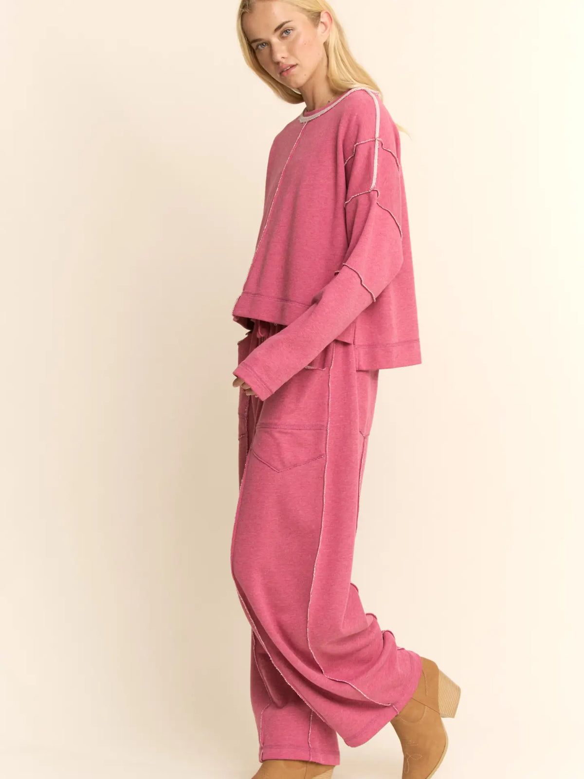 A modern update to loungewear, this two-piece set features a relaxed drop-shoulder top and wide-leg pants with drawstring waist and oversized patch pockets. Contrast raw-edge seams add an effortless, lived-in look, while the soft knit fabric keeps it comfortable yet elevated. A versatile boutique staple, perfect for casual days, travel, or laid-back weekends that call for style and ease. Model is wearing Small Height: 5'10" Bust : 34 Waist : 25” Hips : 35”