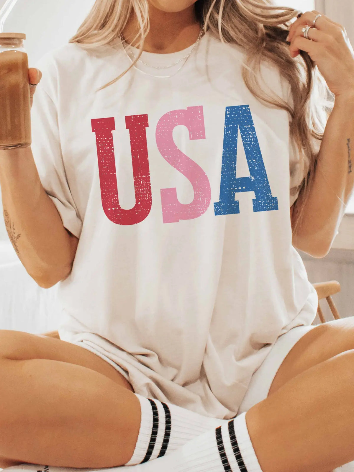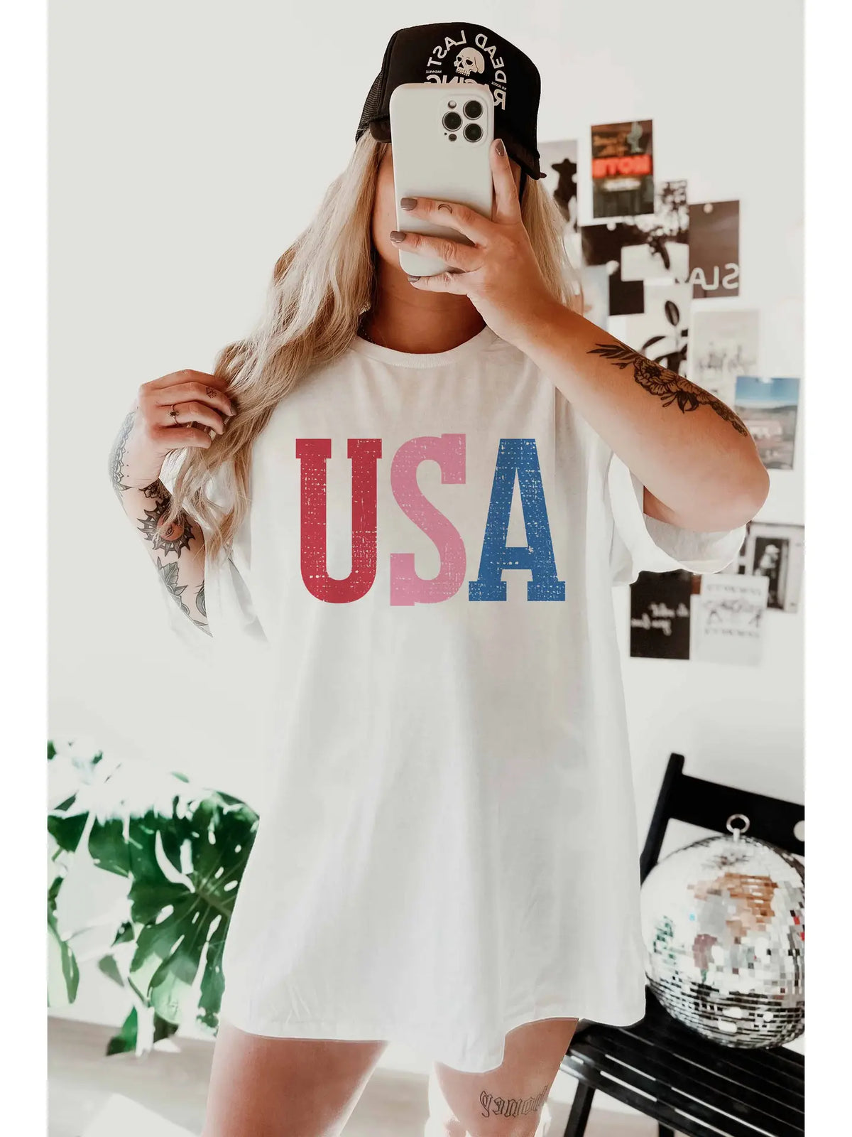 Make a bold statement with this oversized USA tshirt. Featuring a vibrant, large-scale print on a crisp white background, it's designed for comfort and style. Crafted from 100% soft cotton with short sleeves, this tee offers the perfect relaxed fit for everyday wear. Whether you're showing your patriotic spirit or just love the eye-catching design, this versatile piece works great layered or worn solo.