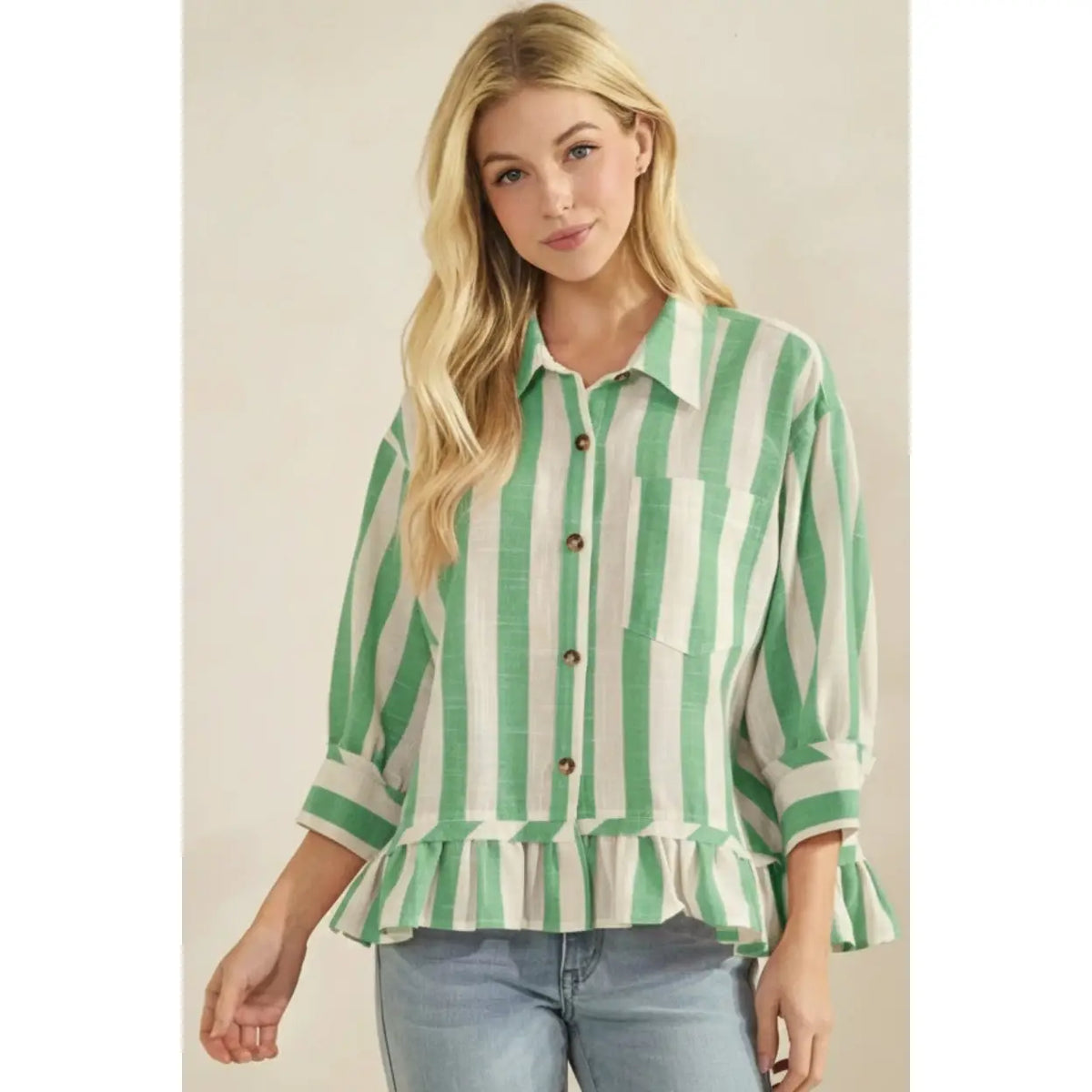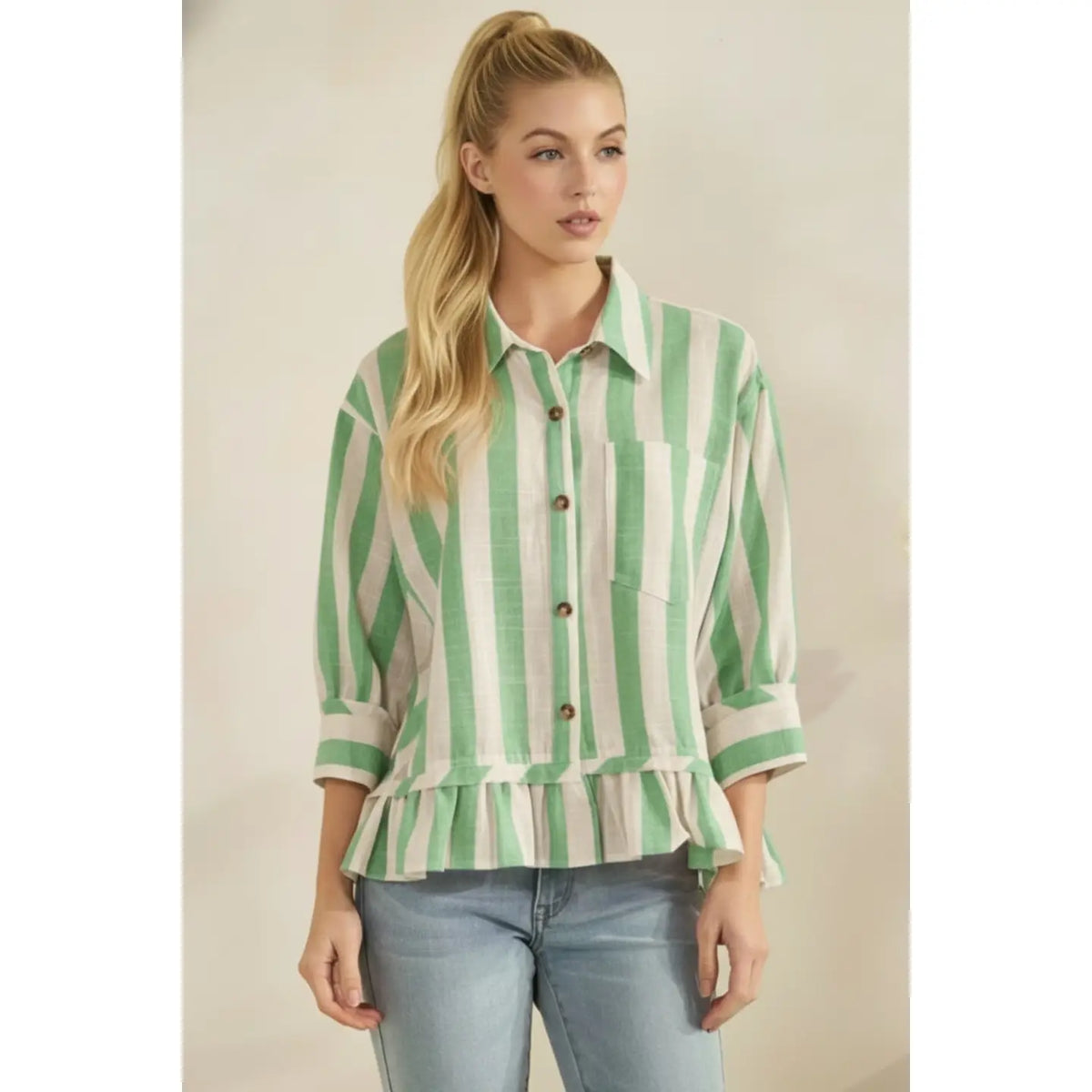 Charming vertical stripe top in soft green with a classic button-down collar and three-quarter length sleeves. The striped pattern adds visual interest while the ruffled hem brings a playful, feminine touch. Perfect for layering or wearing solo, this versatile piece works for casual outings or family gatherings. Easy to care for and designed for all-day comfort.