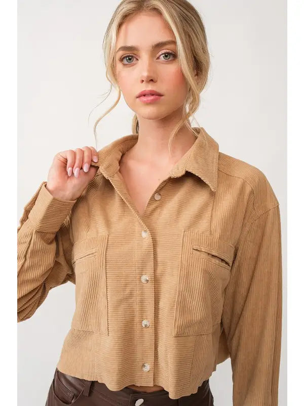 This Alina Corduroy Crop Jacket offers a stylish cropped fit with long sleeves and button cuffs for a polished look. Featuring a classic collar and convenient front pockets, it blends practical design with trendy appeal. Perfect for layering, this jacket adds texture and edge to any outfit.