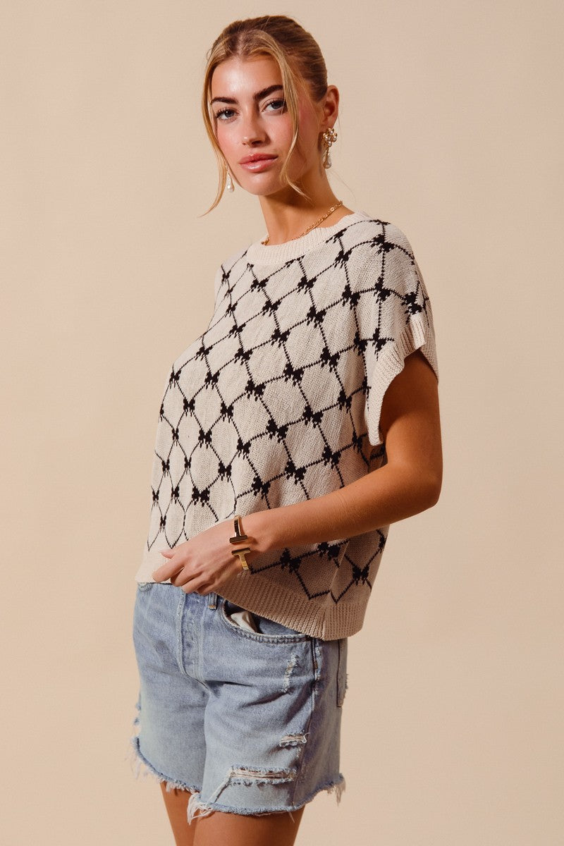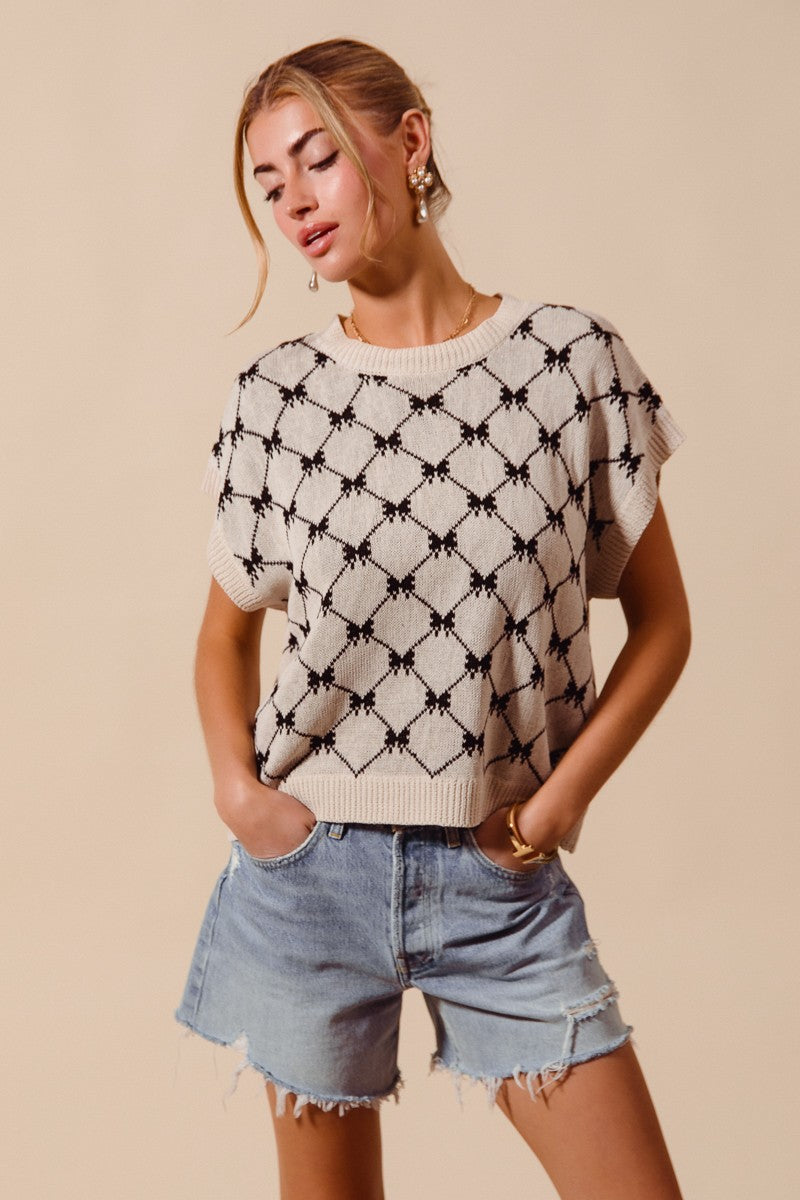 Experience ultimate comfort with this Bow Patterned Sweater. Crafted from soft, lightweight fabric, it offers breathable wear perfect for warmer days. The short sleeves add a casual, versatile touch, making it an easy choice for layering or wearing alone. Enjoy style and comfort together in one effortlessly chic piece.