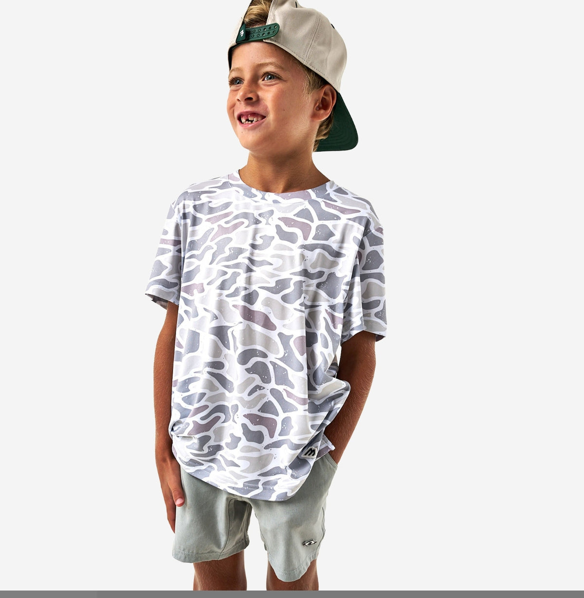 The Burlebo Youth Go To Tee in white Camo delivers comfort that keeps up with active kids. Crafted from soft, breathable performance fabric, this tee wicks moisture away to keep your child cool and dry during play, sports, or everyday adventures. The timeless camo pattern adds rugged style that pairs effortlessly with any outfit. Durable construction means it holds up to repeated wear and washing, making it a reliable staple for any young adventurer's wardrobe.