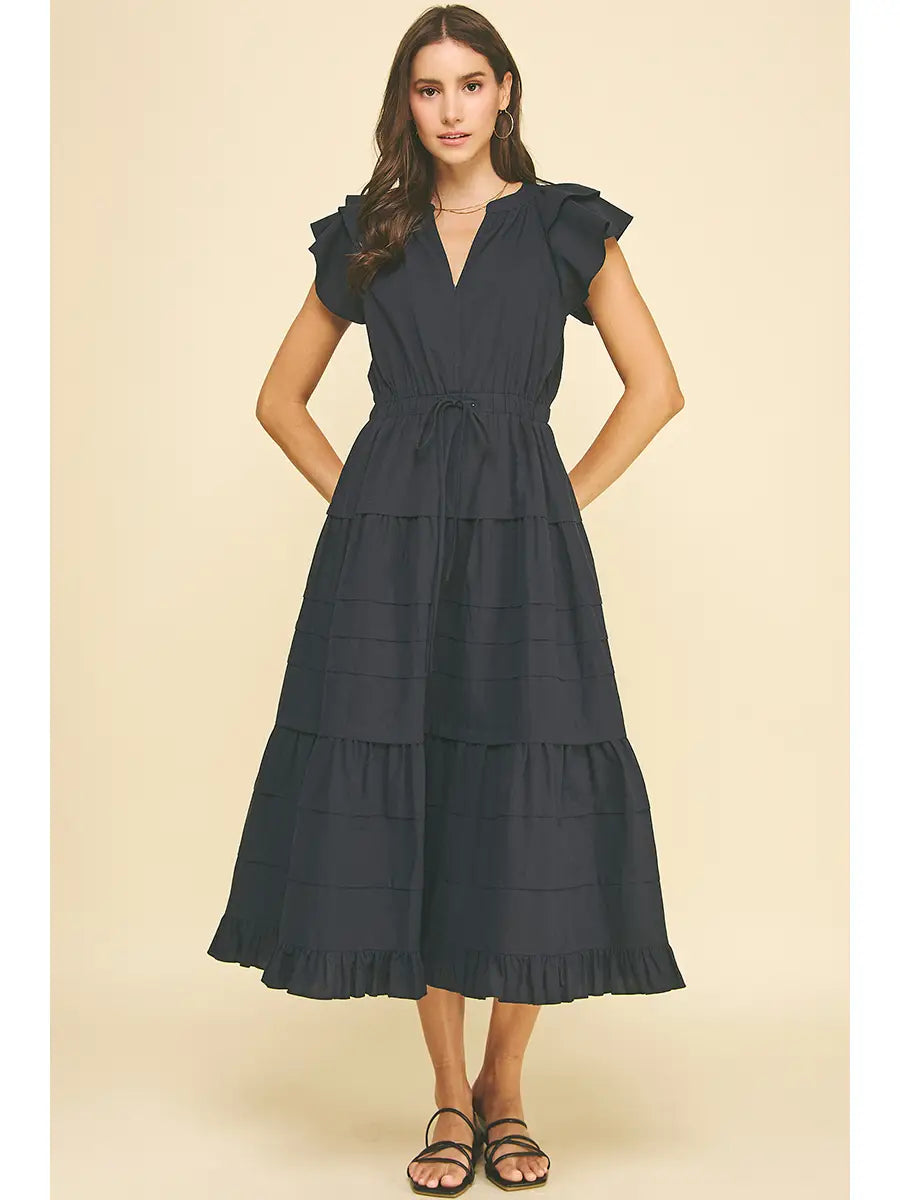 Elevate your wardrobe with the Daucie Black Midi Dress, a timeless piece that effortlessly transitions from day to night. This sophisticated design features a flattering V-neckline and cascading tiered layers that create beautiful movement and dimension. The delicate ruffle sleeves add a touch of feminine elegance while maintaining a polished look. Perfect for everything from casual outings to special occasions, this versatile black midi dress is the foundation piece every woman needs. Comfortable, chic, and endlessly stylish.