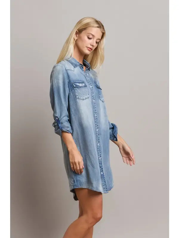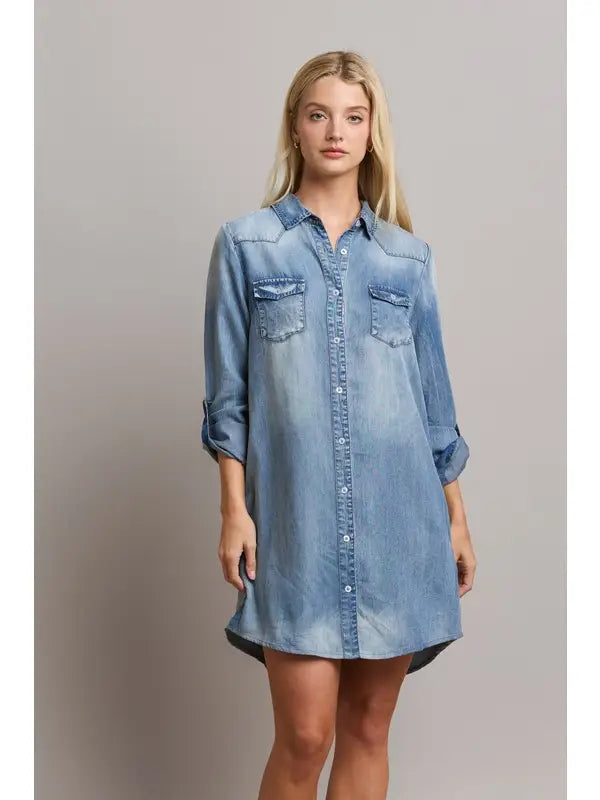 Effortlessly versatile, this denim shirt dress combines timeless style with everyday comfort. Crafted from soft denim, it features a classic button-down front and long sleeves for layered styling options. The relaxed frayed hem adds a touch of casual charm, making it perfect for dressing up or down. Whether paired with boots for a polished look or sneakers for laid-back weekend vibes, this wardrobe essential transitions seamlessly from day to night. A must-have piece that works as hard as you do.