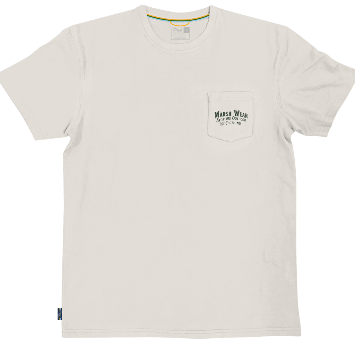 Stay comfortable and stylish with the Marsh Wear Sportsman Pocket T-shirt in a soft cream color. Featuring a striking graphic of a duck hunter on the back, this shirt captures the spirit of outdoor adventure. Perfect for nature lovers and hunting enthusiasts, it combines casual wearability with a bold, rugged design that stands out in any setting. Whether you're heading out for a day in the marsh or relaxing with friends, this tee offers both comfort and character.