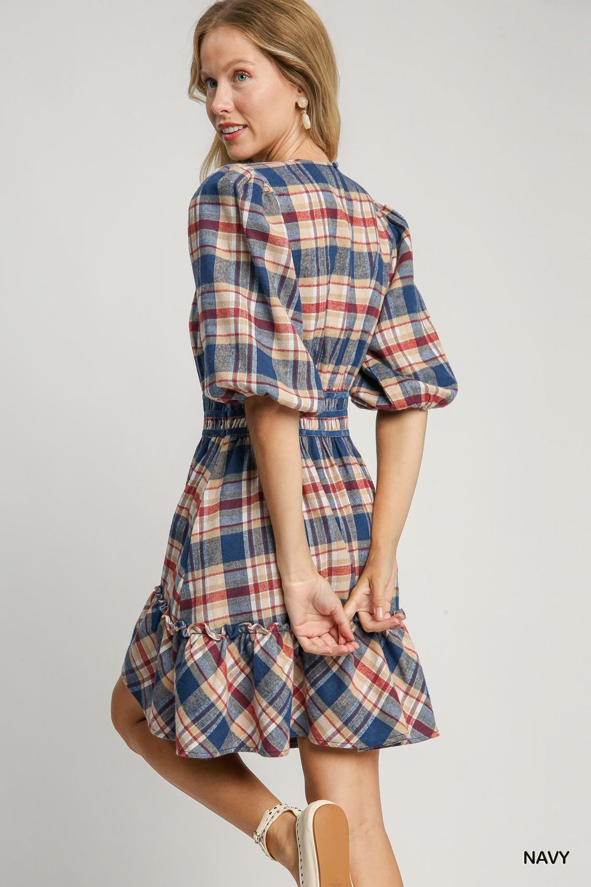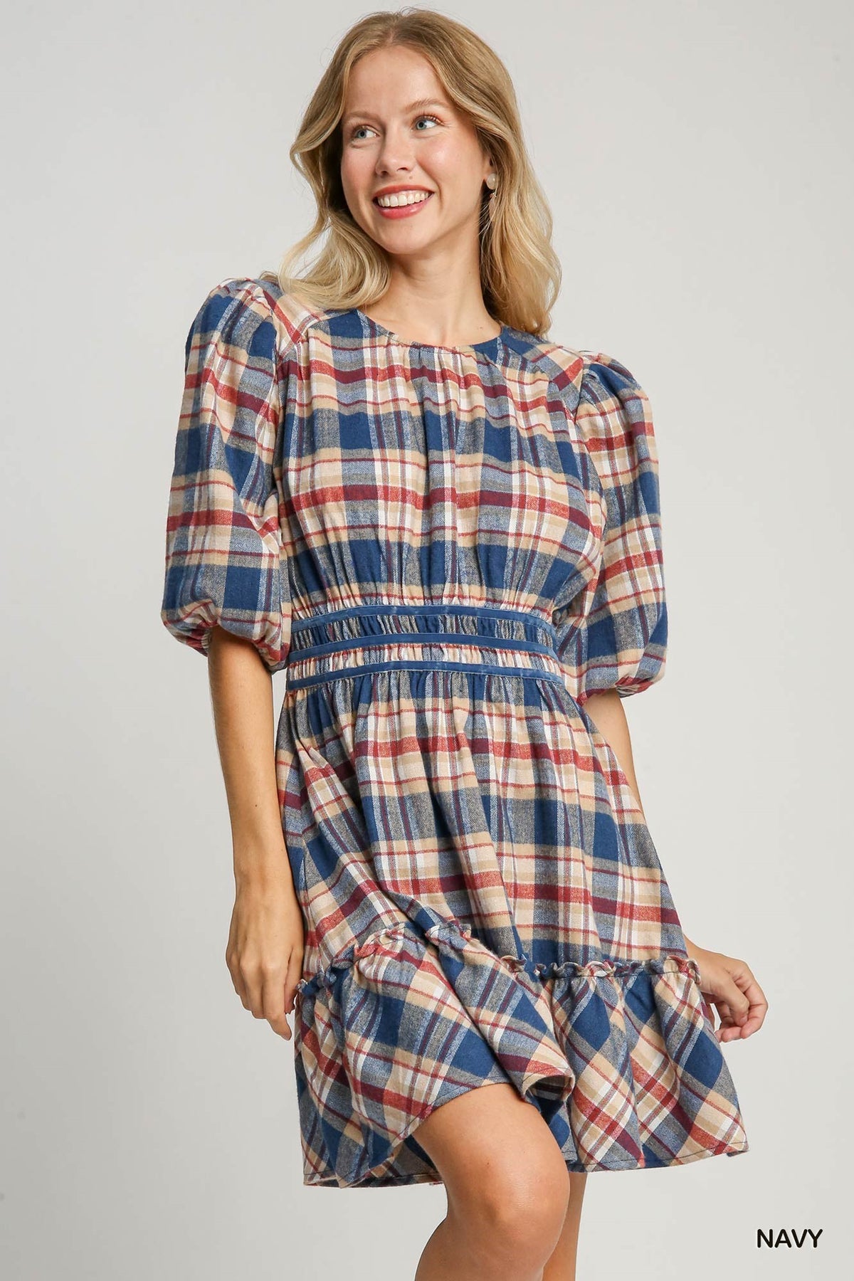 This dress exudes sophistication and femininity with its bold navy and red plaid print. The soft velvet trim adds a touch of luxury to the overall design. The elastic waist ensures a comfortable and flattering fit for any body type. Be effortlessly stylish in the Nicole Plaid Dress.