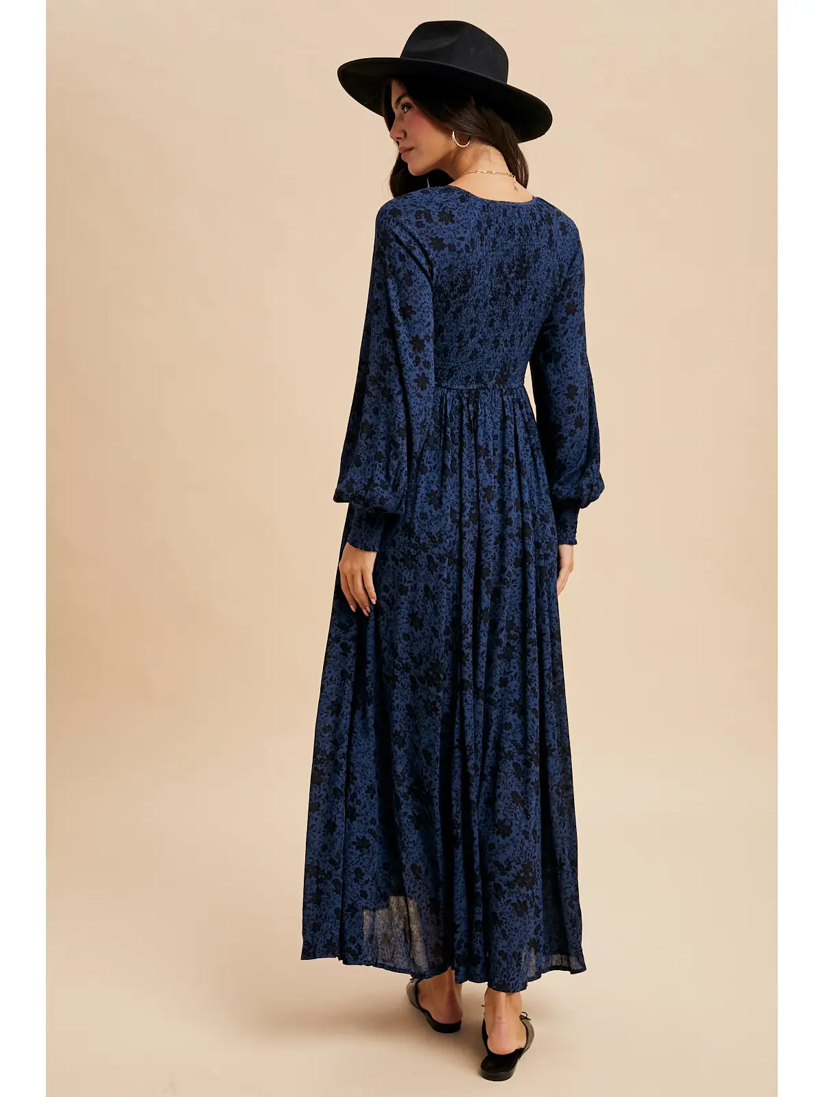 The Shay Smocked Floral Maxi combines timeless elegance with modern comfort. Featuring a flattering V-neck and long sleeves adorned with delicate lines, this maxi dress in rich indigo blue offers a graceful silhouette and effortless style. The smocked bodice enhances fit while the flowing skirt ensures freedom of movement, making it perfect for both casual outings and special occasions. Elevate your wardrobe with this versatile and eye-catching piece.