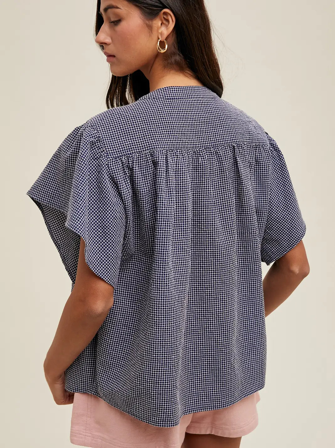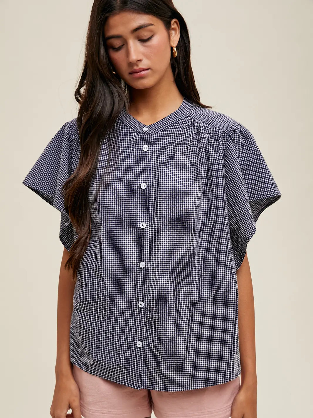 The Tessa Gingham Top features a classic blue gingham pattern that pairs effortlessly with any wardrobe. Cut with comfortable short sleeves, this button-down top offers a polished look for casual outings or layering. The structured fit and quality construction make it a versatile staple you'll reach for again and again.